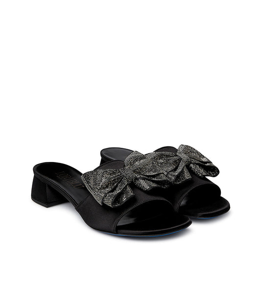 Black satin mules with bow