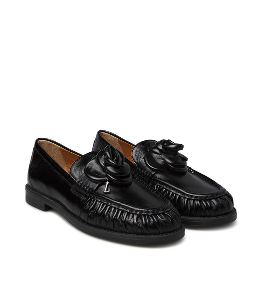 Flower decorated black nappa leather loafers