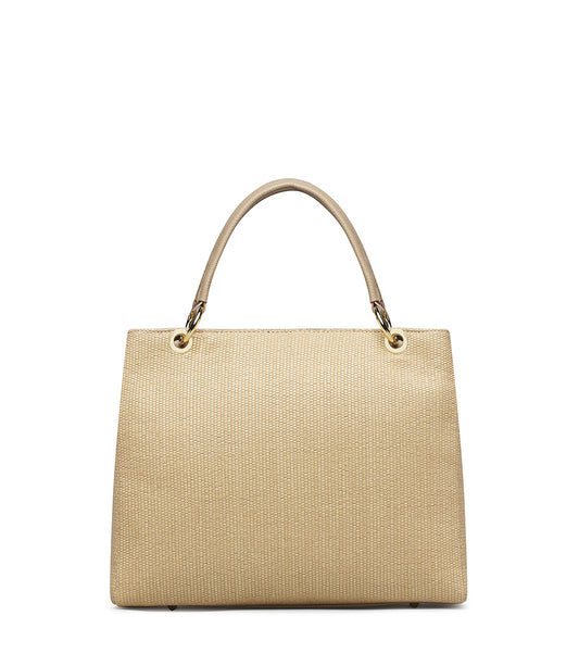 Cream-toned raffia tote bag with silver metal details