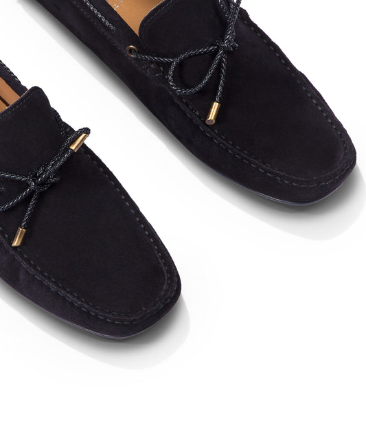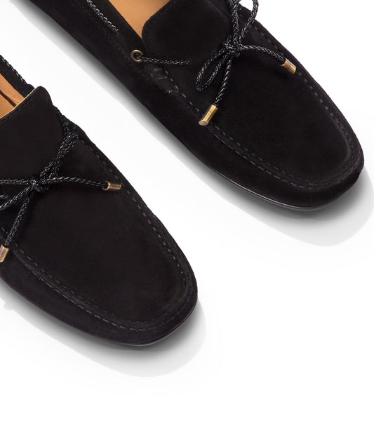 Mocassini in camoscio e shearling nero con fibbia-logo