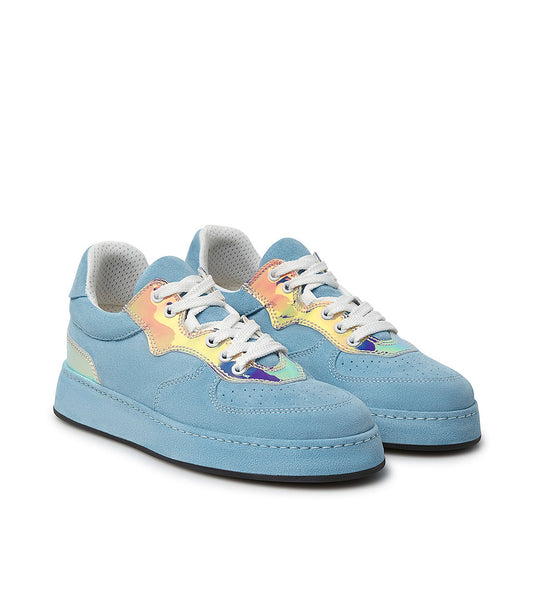 Sneakers in velour celeste e vernice multicolor