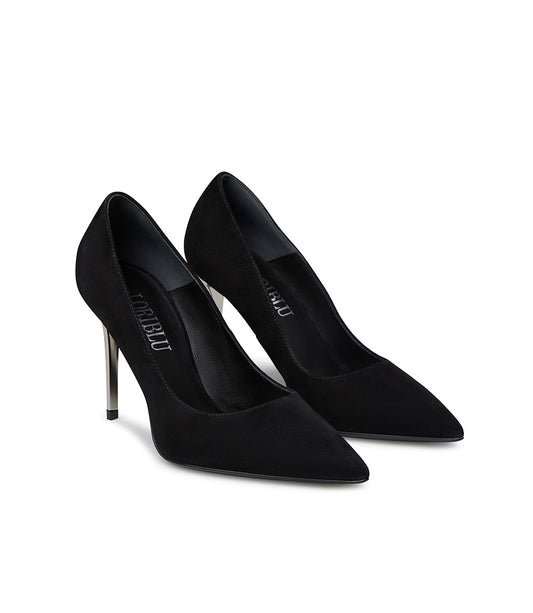 Décolleté in camoscio nero con tacco in metallo argento