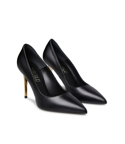 Décolleté in vitello nero con tacco in metallo oro