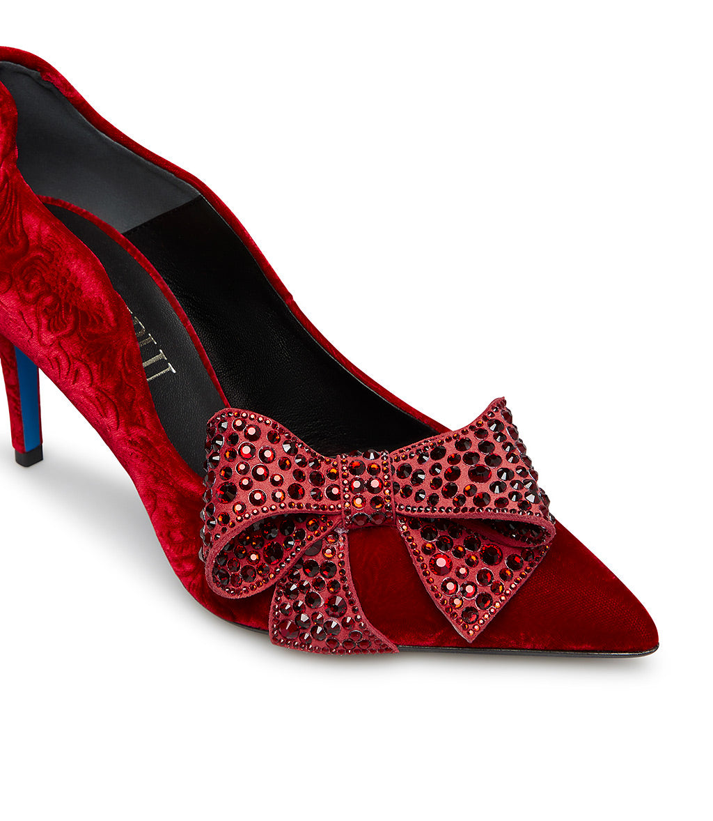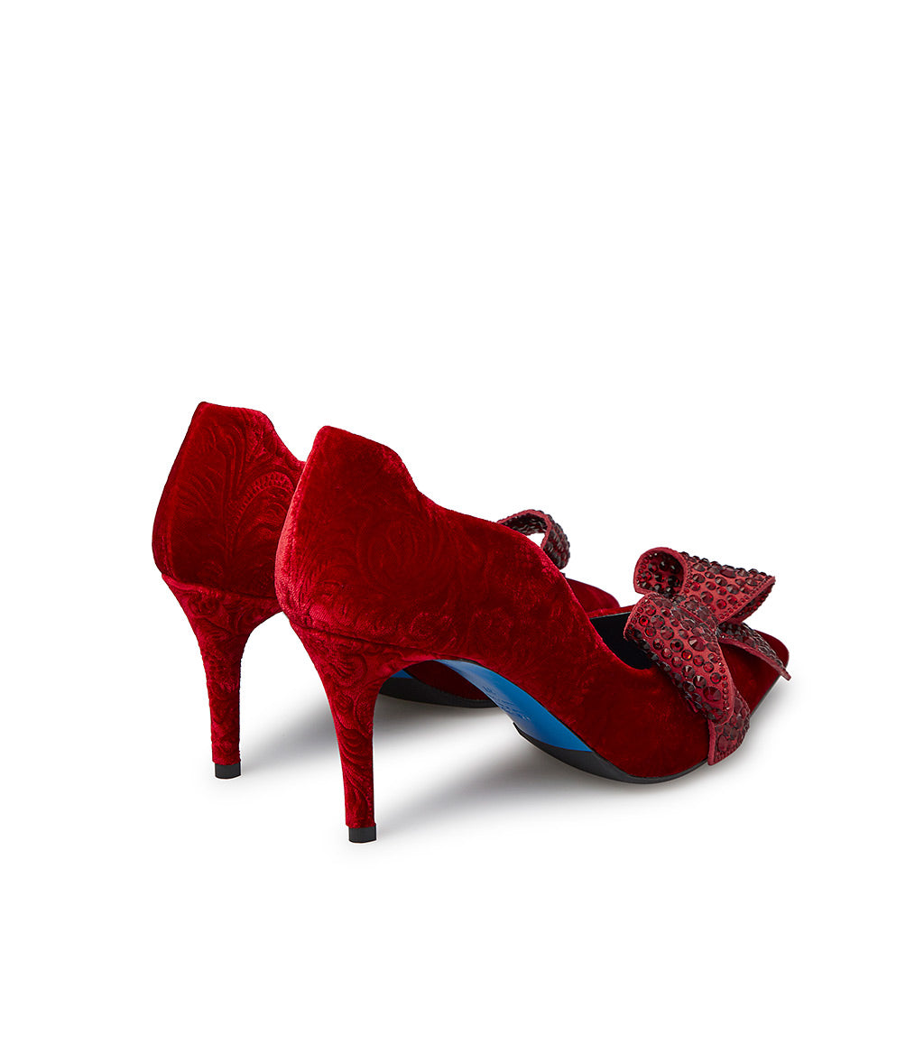 Décolléte in velluto damascato rosso con fiocco