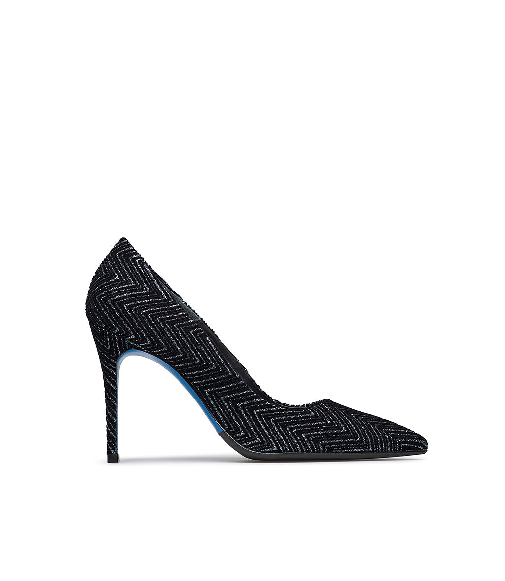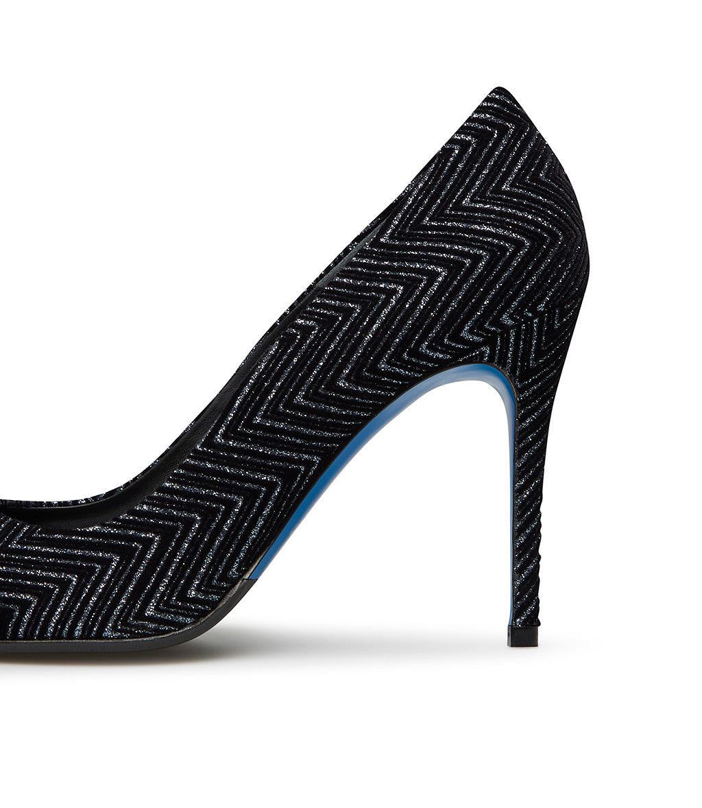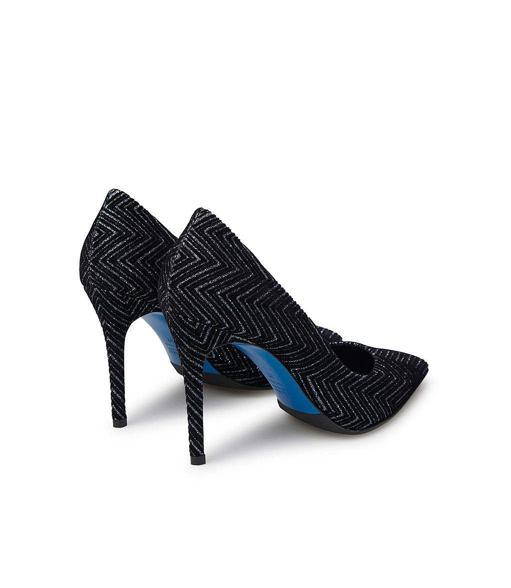 Design elegante e senza tempo per le nuove décolleté Loriblu in velluto nero con texture a rilievo disegno geometrico, capaci di esaltare l'outfit più raffinato sia per il giorno che per la sera. Un vertiginoso tacco a spillo e l'iconica suola blu completano il modello