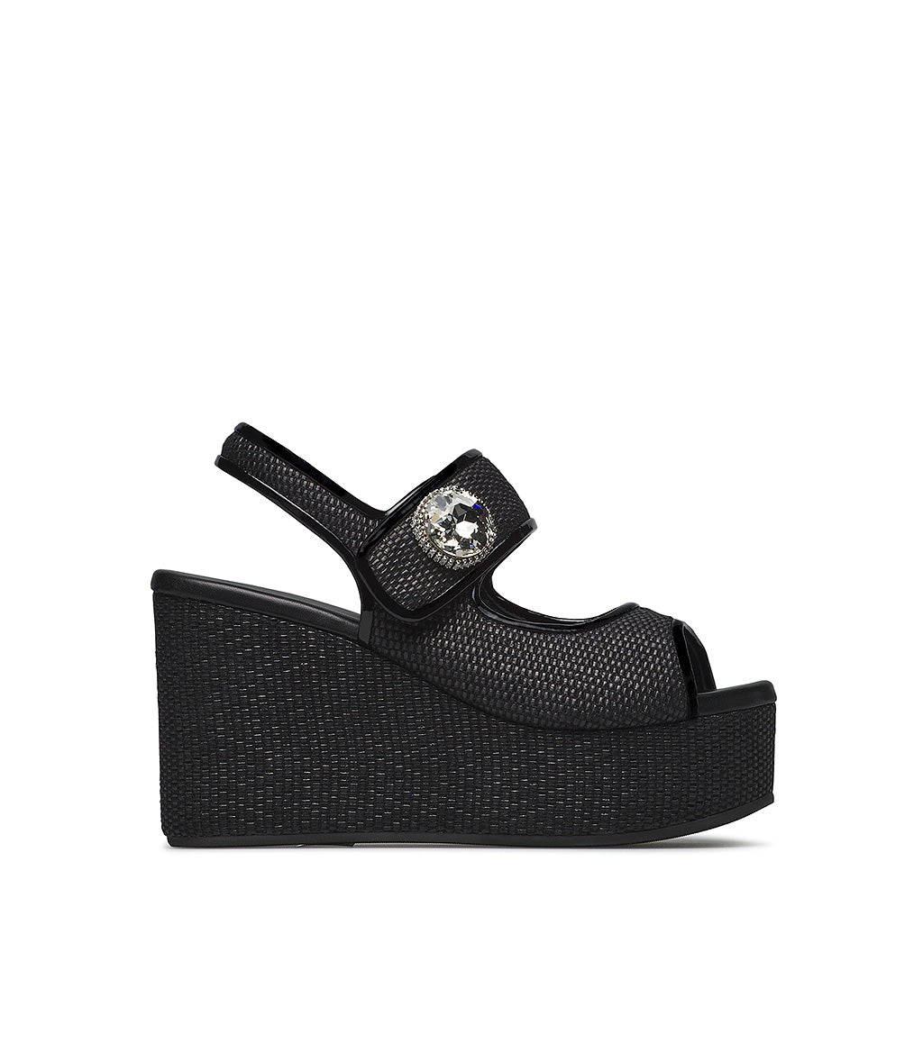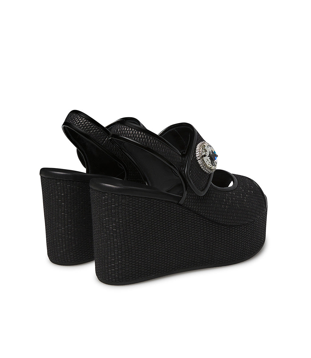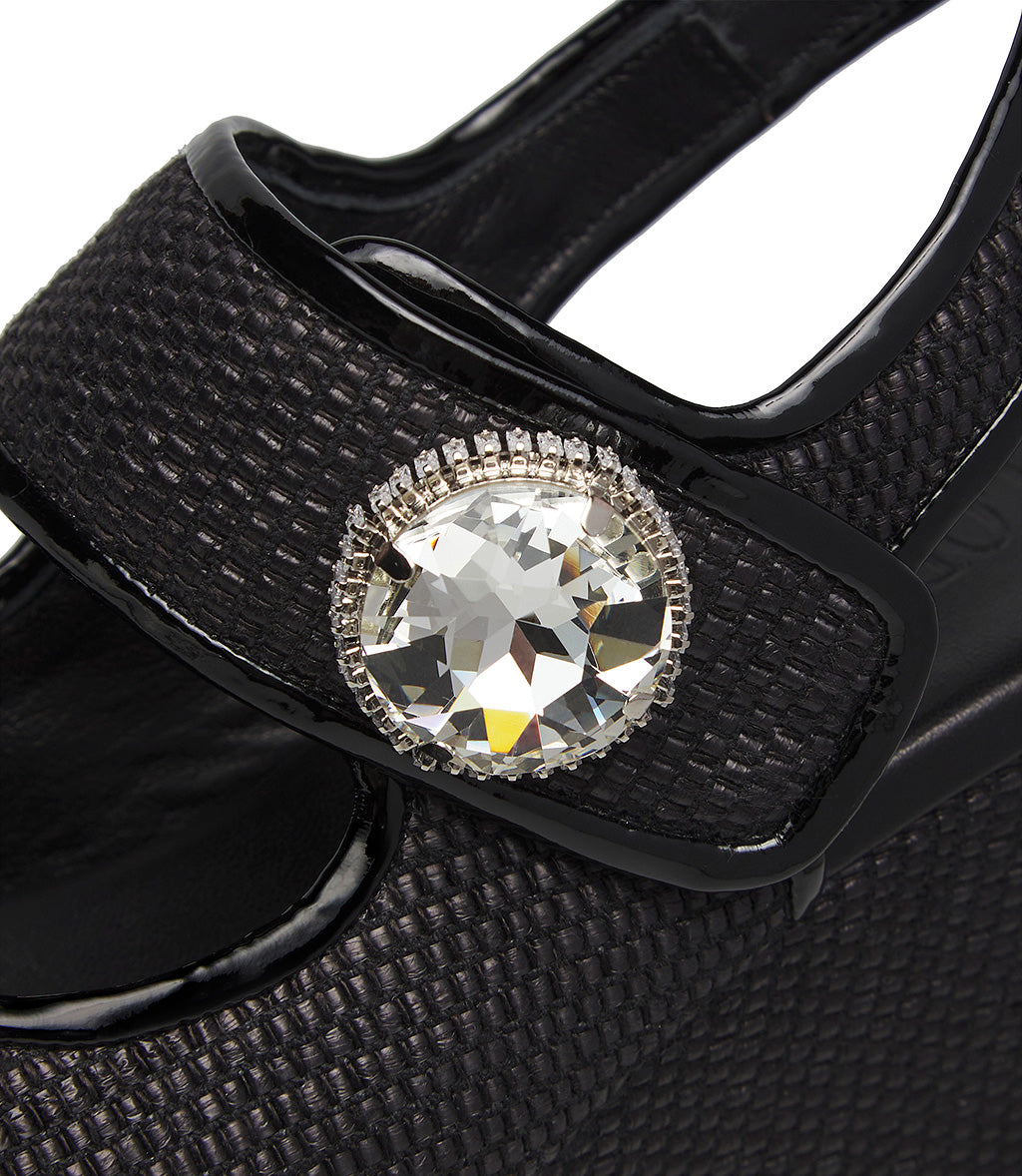 Sandalo zeppa in nappa e rafia nero con gioiello