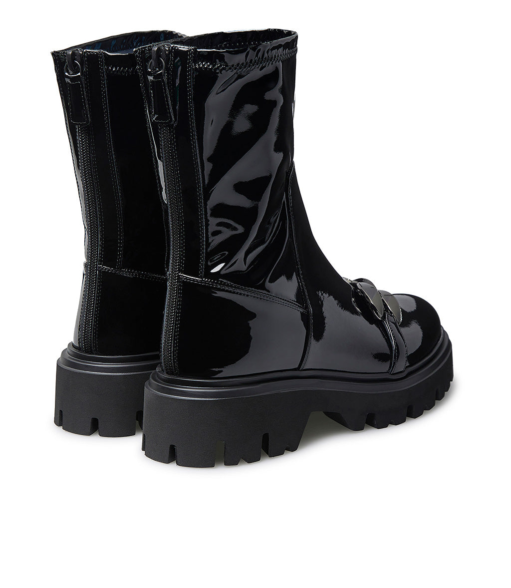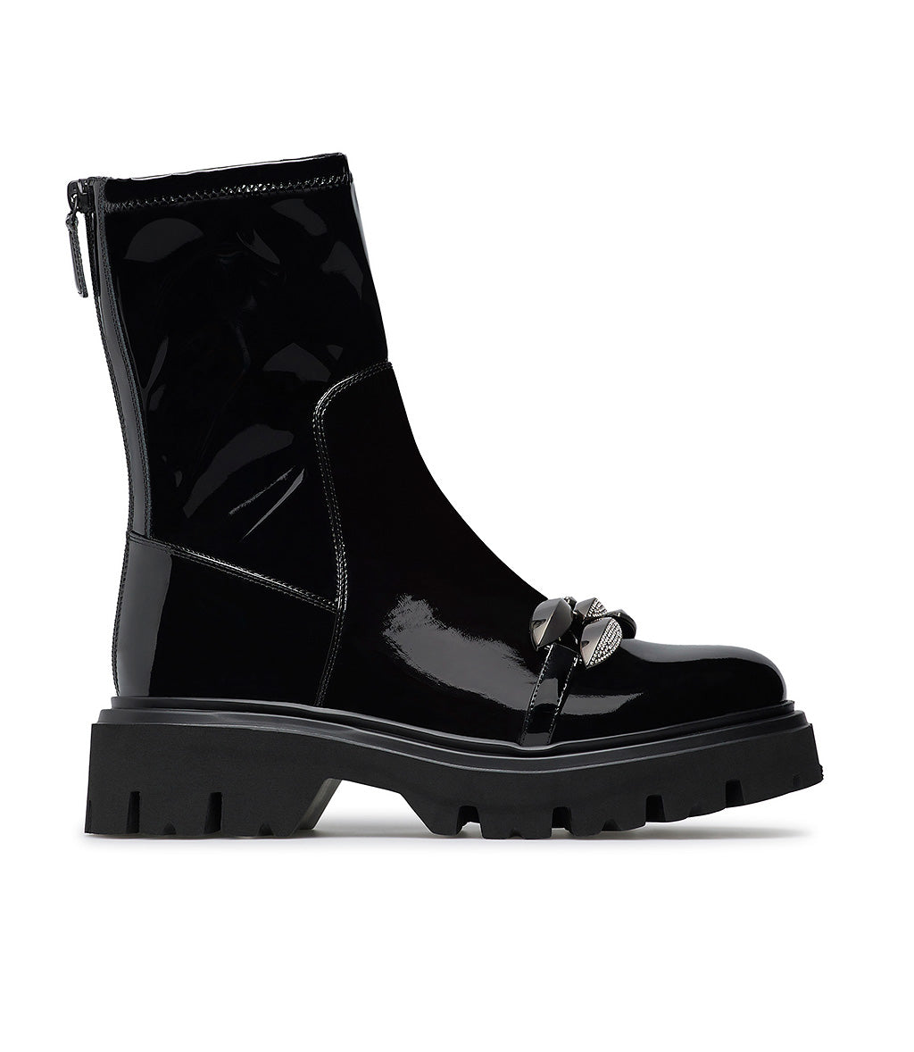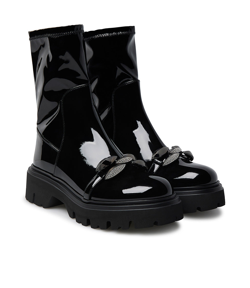 stones decorated black patetn leather combat ankle boots