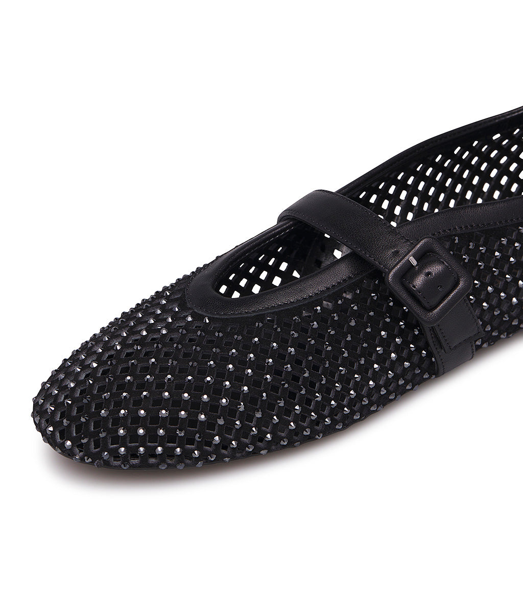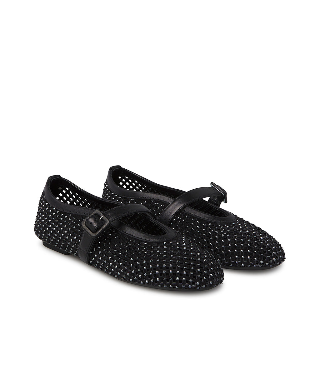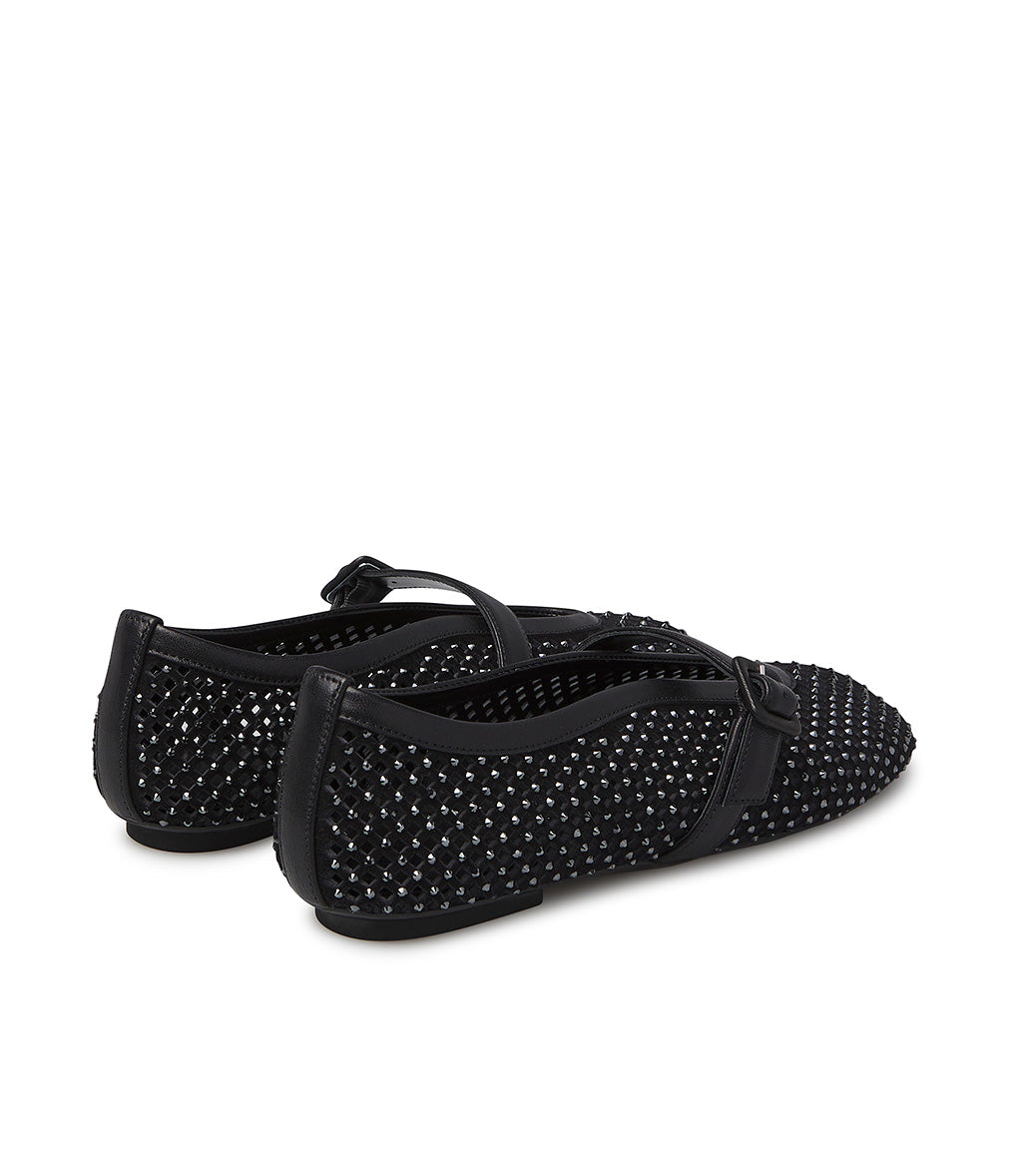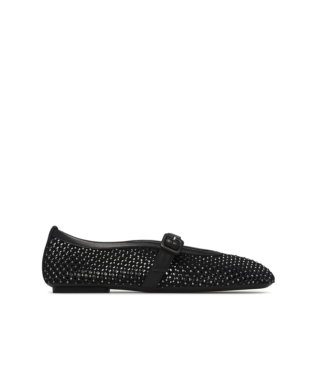 The classic ballerinas take on a new, irresistible allure. Crafted in Italy from black suede with black nappa leather trim and buckle, they feature a geometric cutout design embellished with silver-toned crystals. They feature a rounded toe and rubber sole. Wear them from day to night with your most feminine looks.