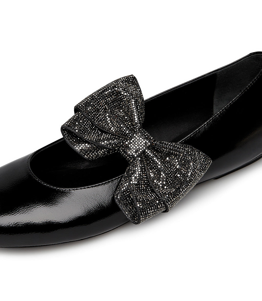 The new 100% made in Italy ballerinas, crafted by our artisans in shiny black leather, are the perfect combination of versatility and comfort. Featuring a comfortable sole and delicate details, they are embellished with a microcrystal bow on the adjustable strap. A symbol of femininity and simplicity, our new ballerinas will win you over.