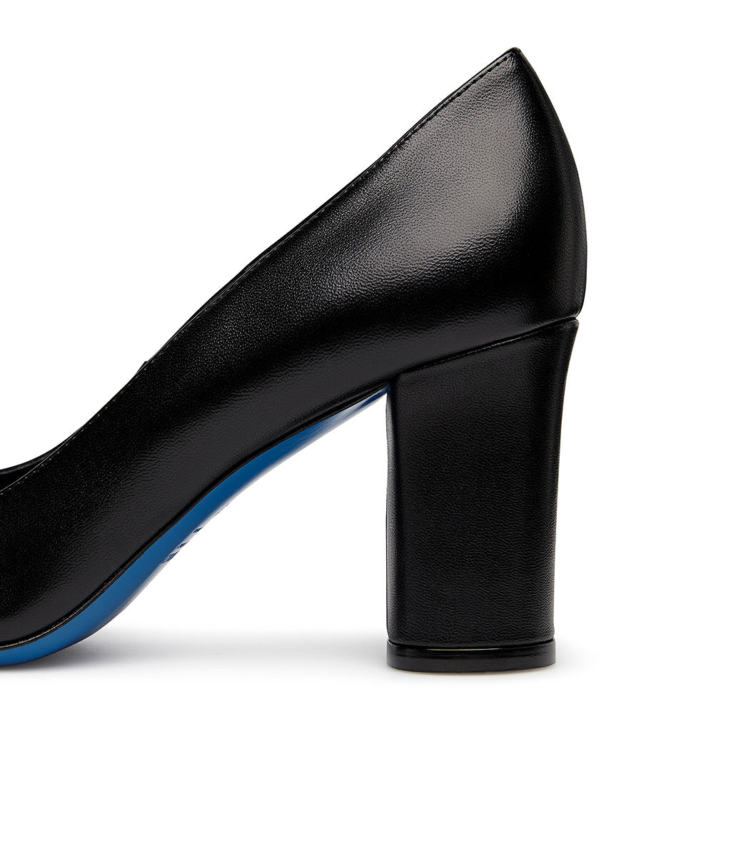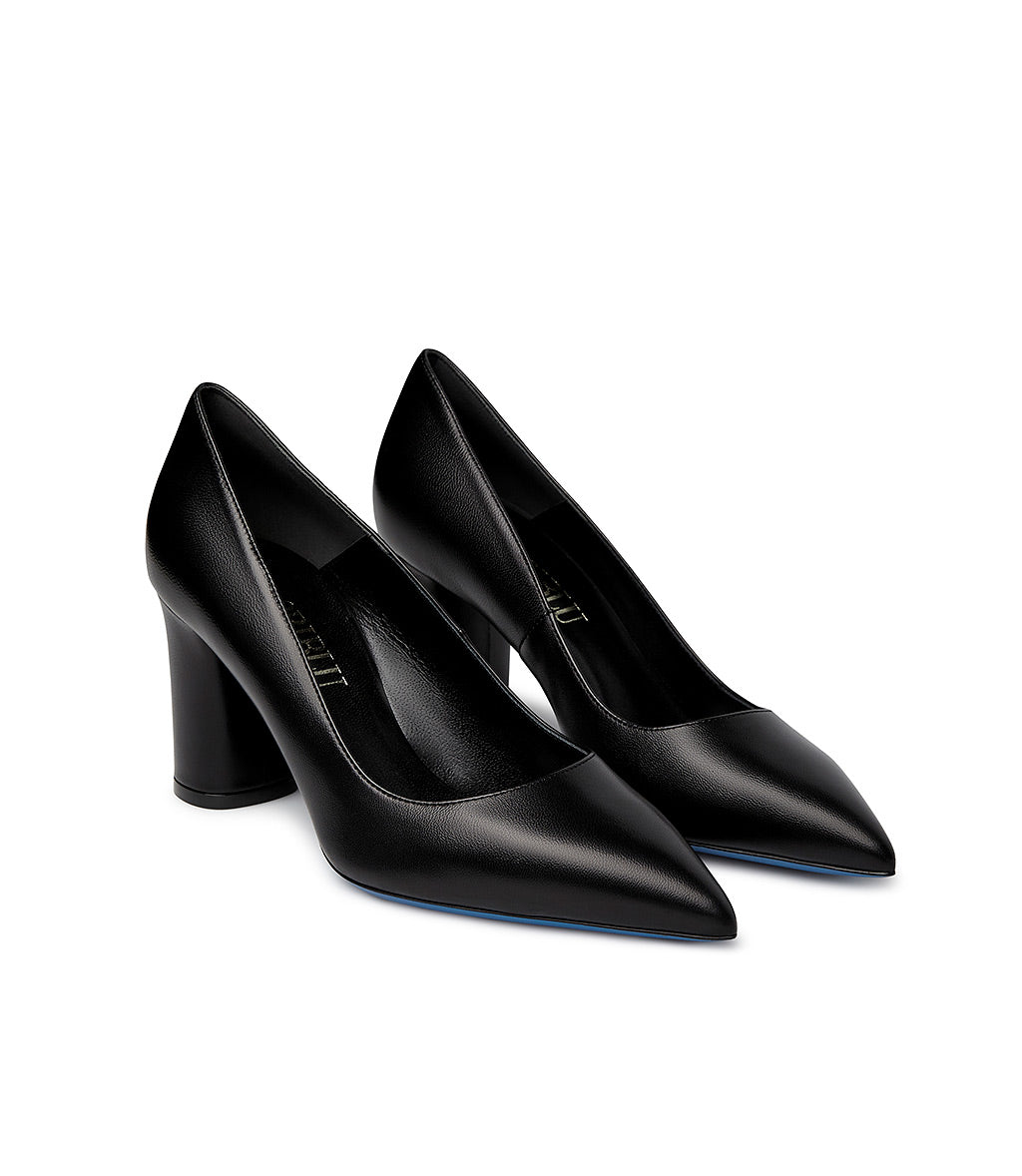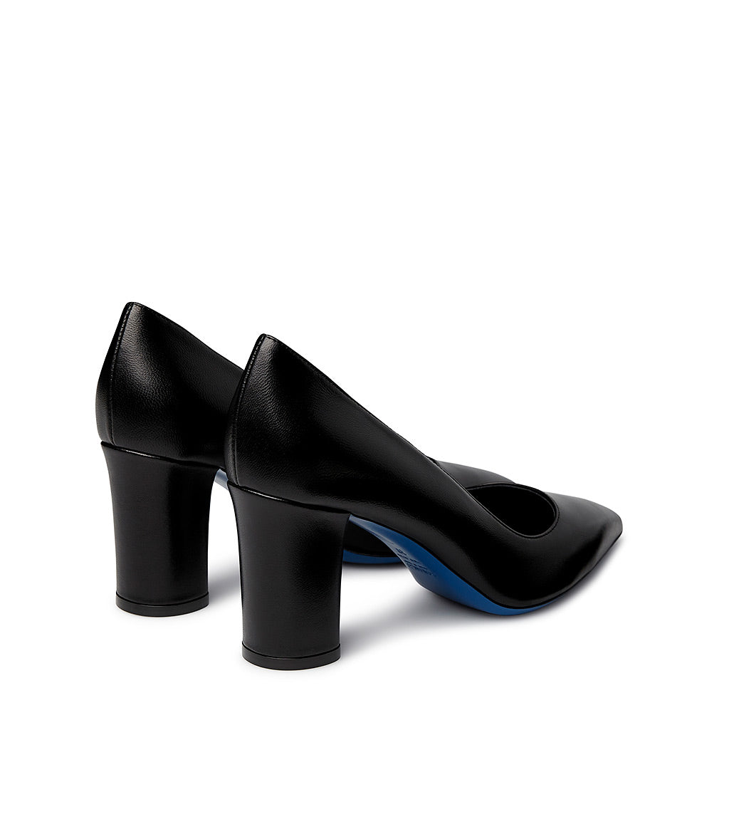 Elevated by a high block heel, our black nappa pumps perfectly combine comfort and elegance. They're meticulously crafted in Italy and feature a pointed toe, leather lining and insole, and a distinctive blue leather sole. Wear them every day with your favorite outfits.