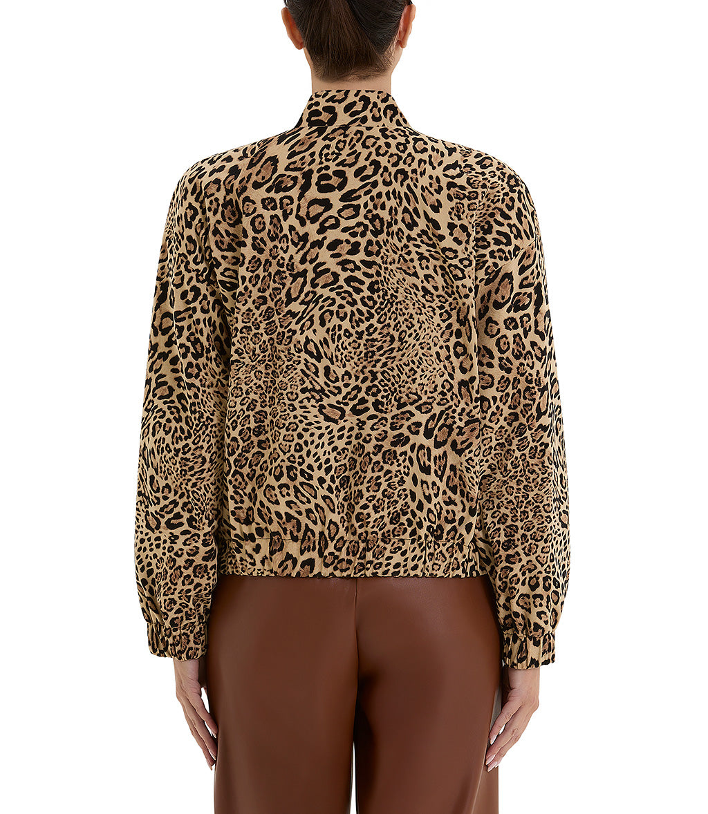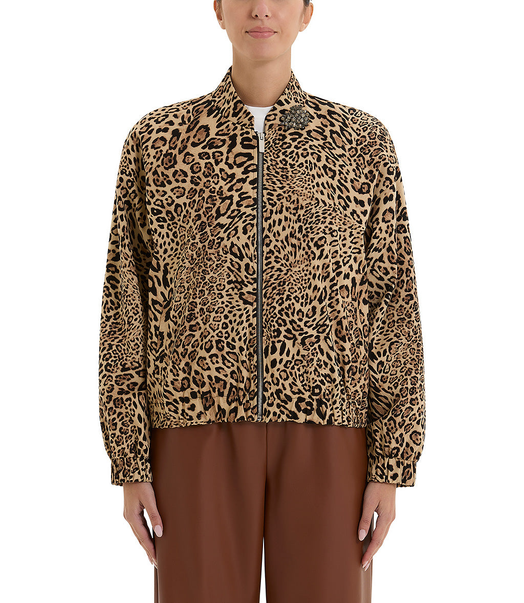 Long-sleeved jacket with leopard animal print and jewel detail on the chest. It features an officer collar, front zip closure and elastic trim on cuffs and hem.