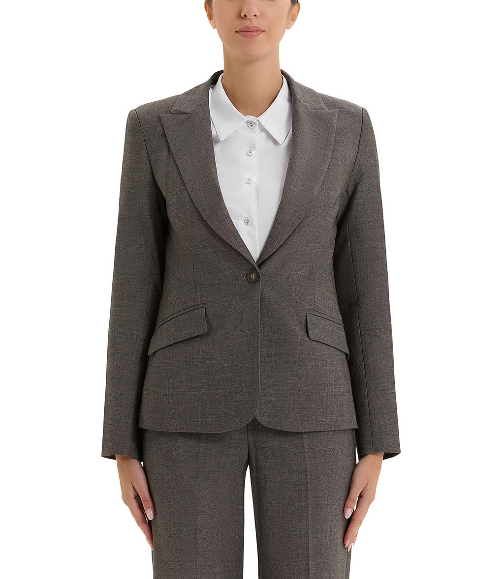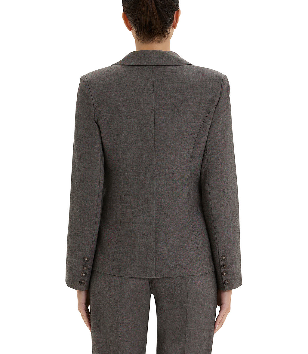 Grey single-breasted jacket with asymmetric lapel. Featuring darts and welt pockets with flap.