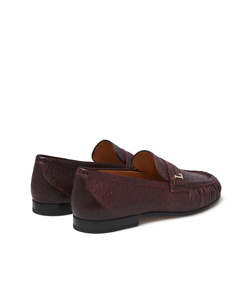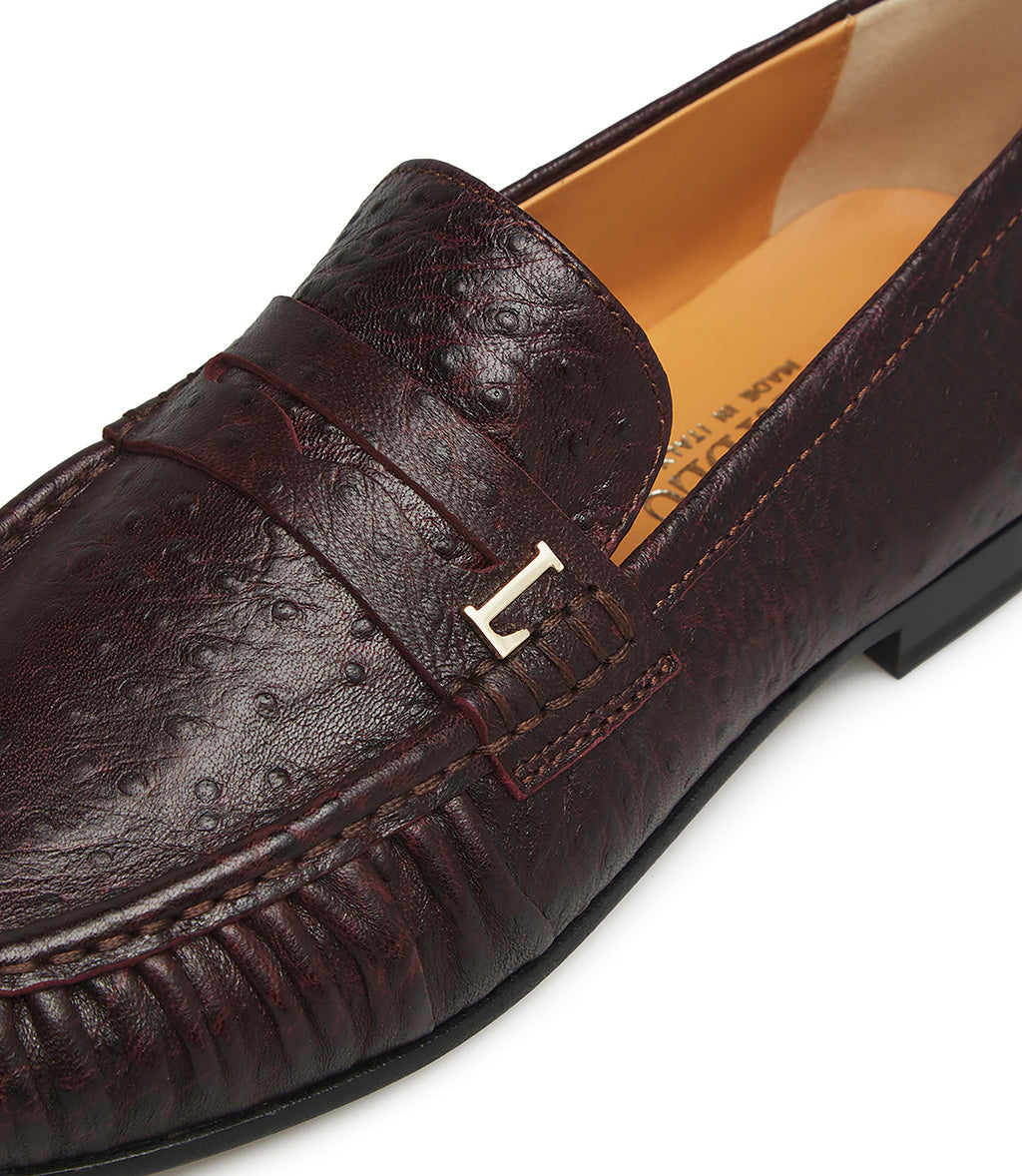 Made in Italy, our loafers in fine dark brown ostrich-print leather feature a flawless and timeless silhouette. They sit on a leather sole and reveal a rounded toe with a gathered line highlighted by raised stitching. Ideal for everyday wear.