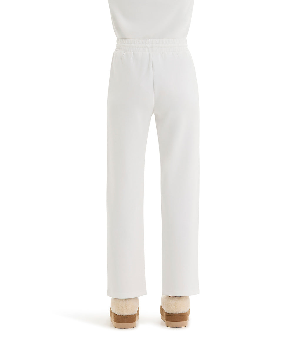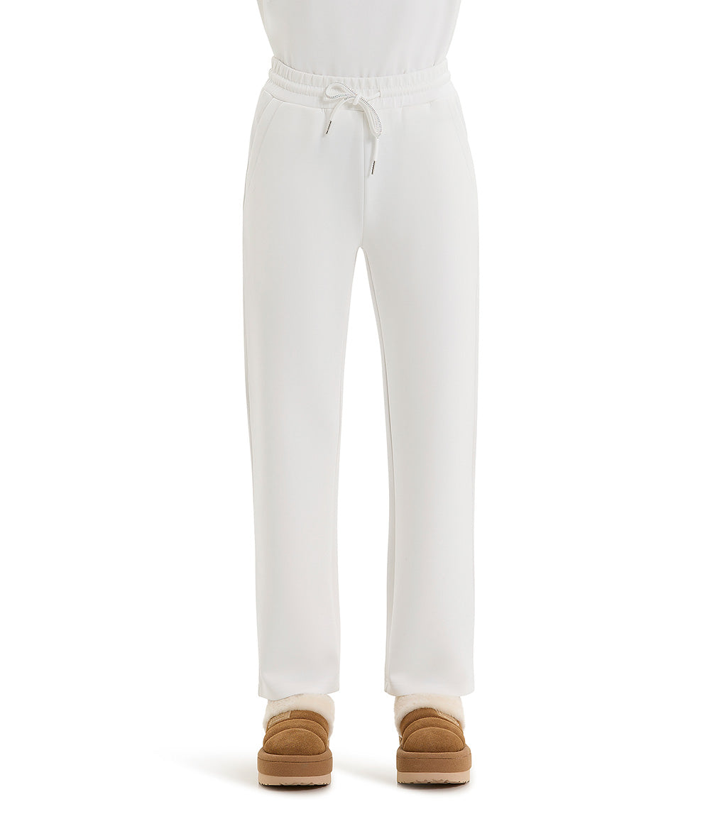 Vanilla-colored viscose and polyester straight-fit trousers with elasticated waist. They feature drawstrings with colored glitter, French pockets decorated with overlock stitch using shiny thread.