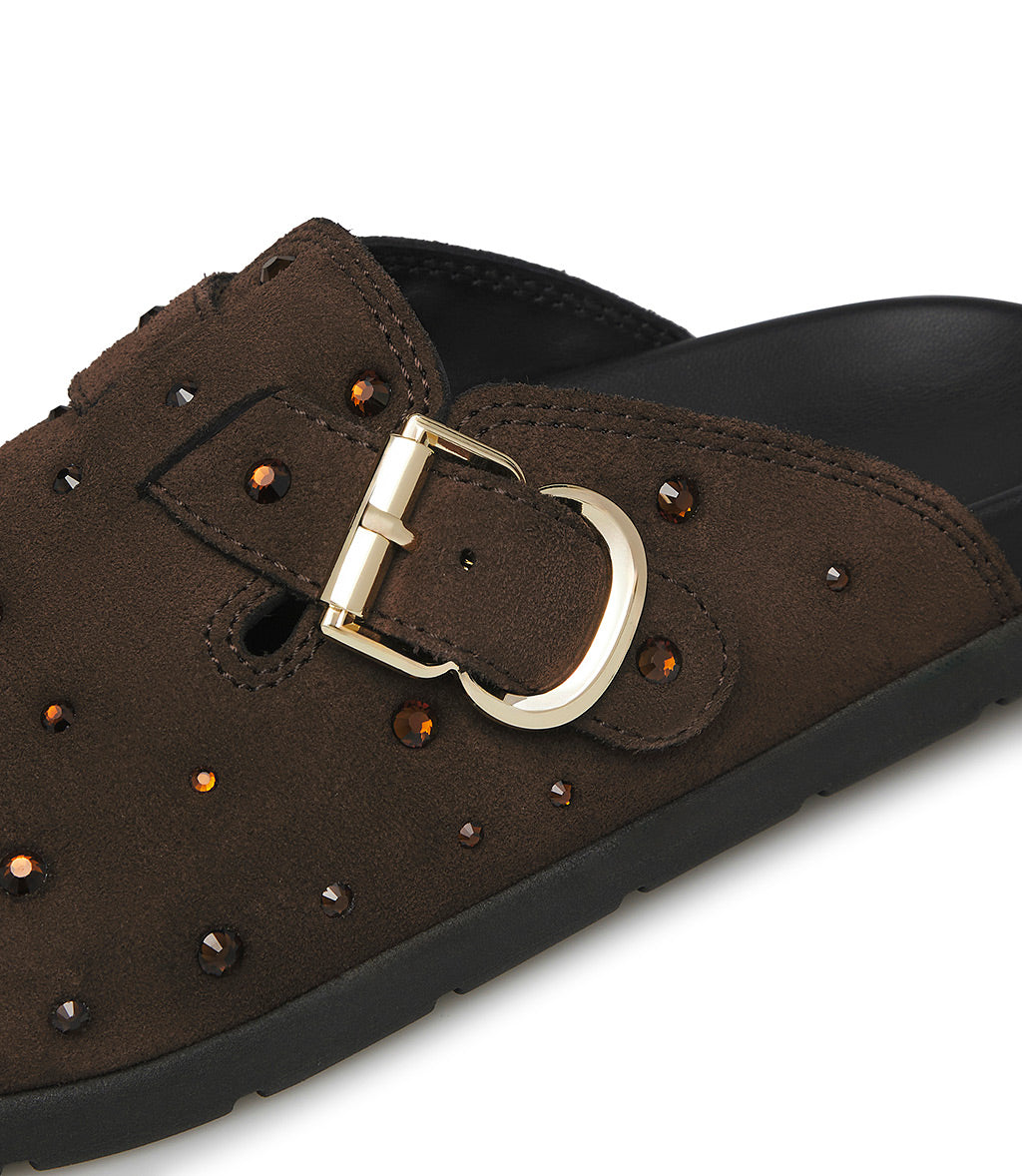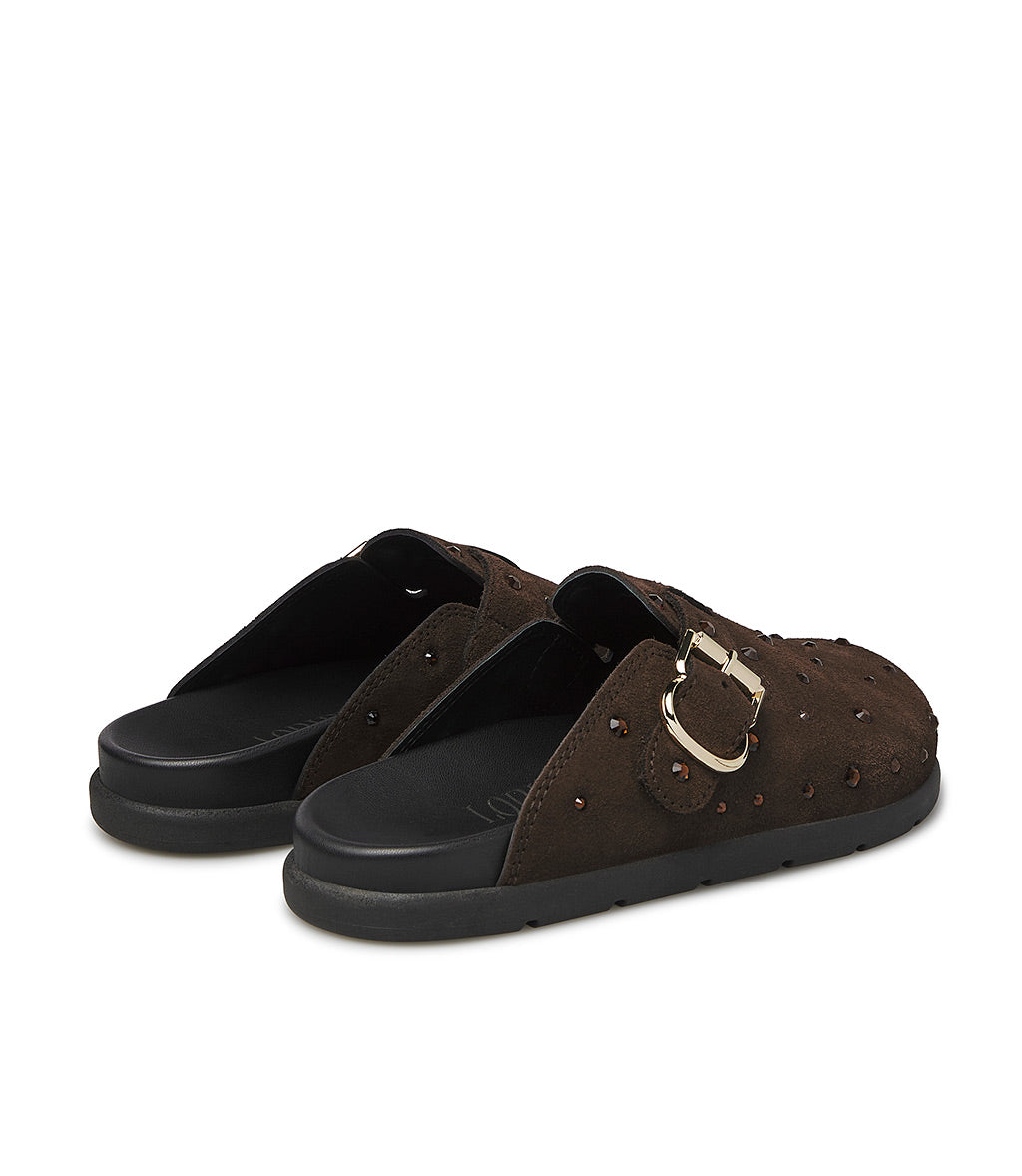 A cool alternative to classic sneakers, our dark brown suede slippers feature a comfortable, ergonomic design embellished with crystals and a gold-tone metal buckle strap. They're meticulously crafted in Italy and feature a rounded toe and a contrasting black rubber sole for a sporty touch.