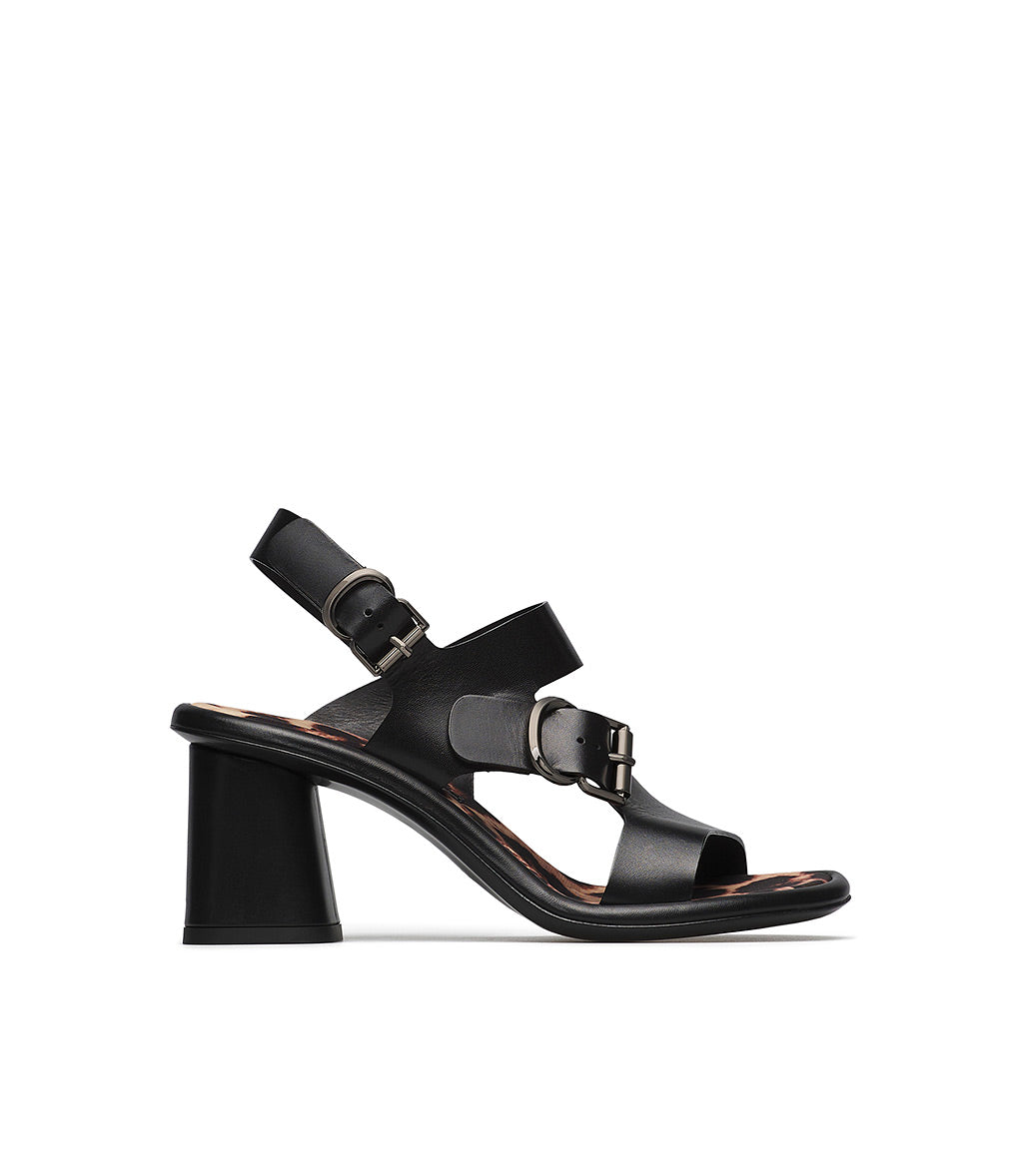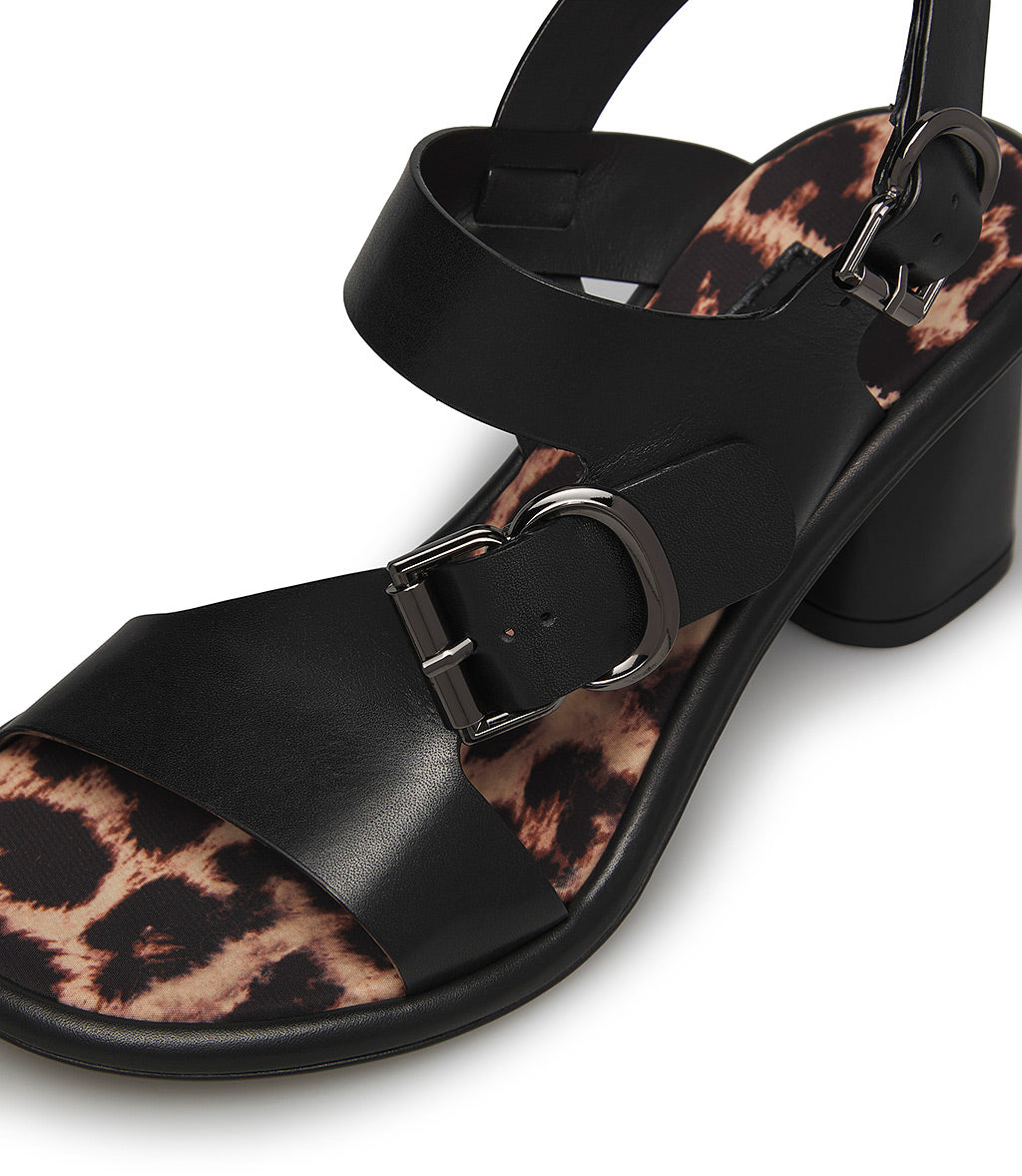 Elegant and versatile, perfect for any occasion, our black calfskin sandals stand out thanks to the modern, minimalist design of the front and diagonal straps and the leopard-print fabric insole. With an adjustable ankle strap and slightly flared block heel, the style ensures stability and comfort. Ideal for pairing with everyday outfits.