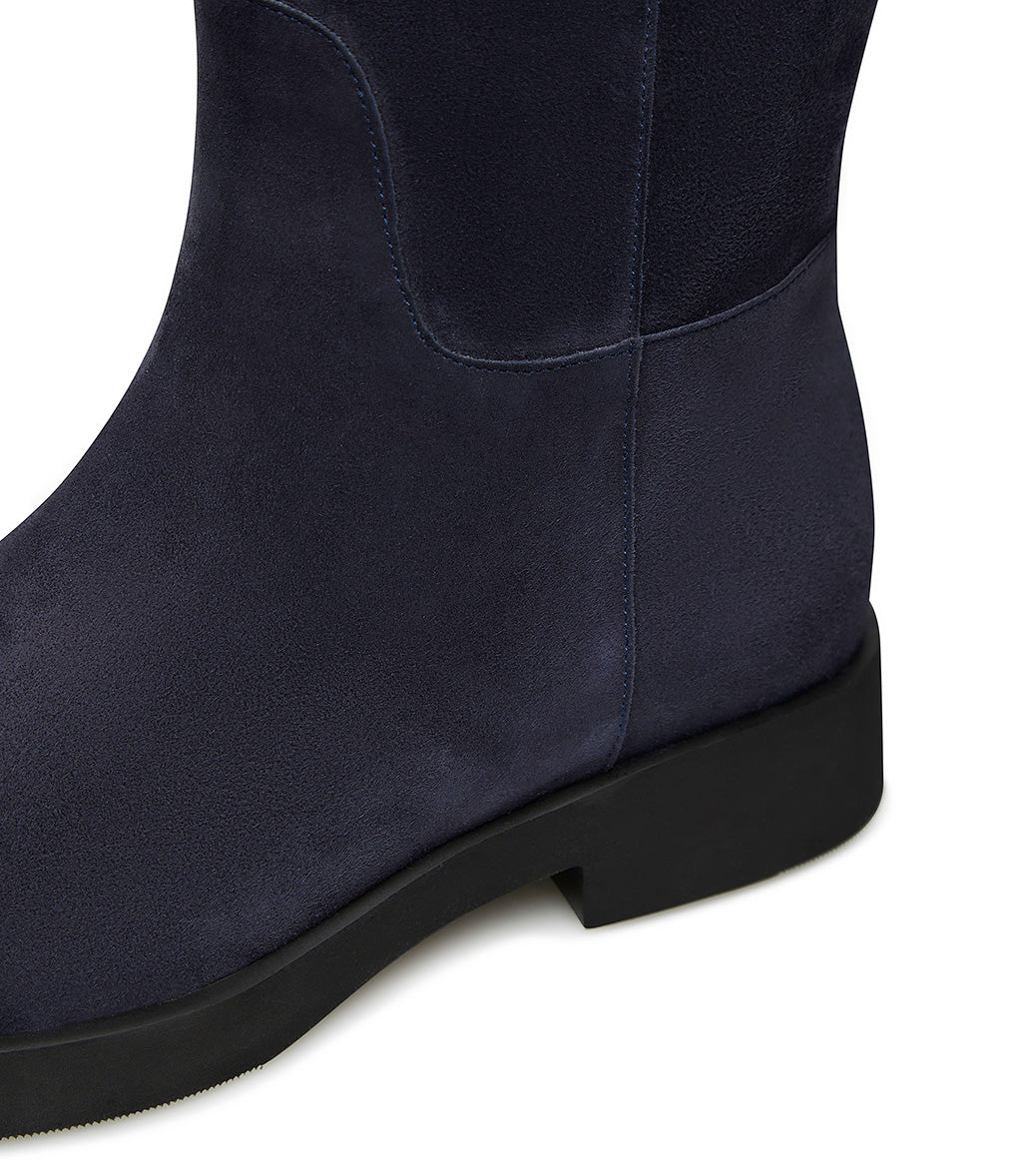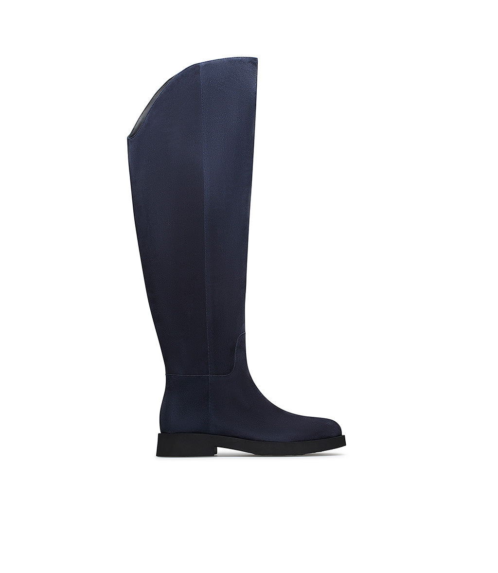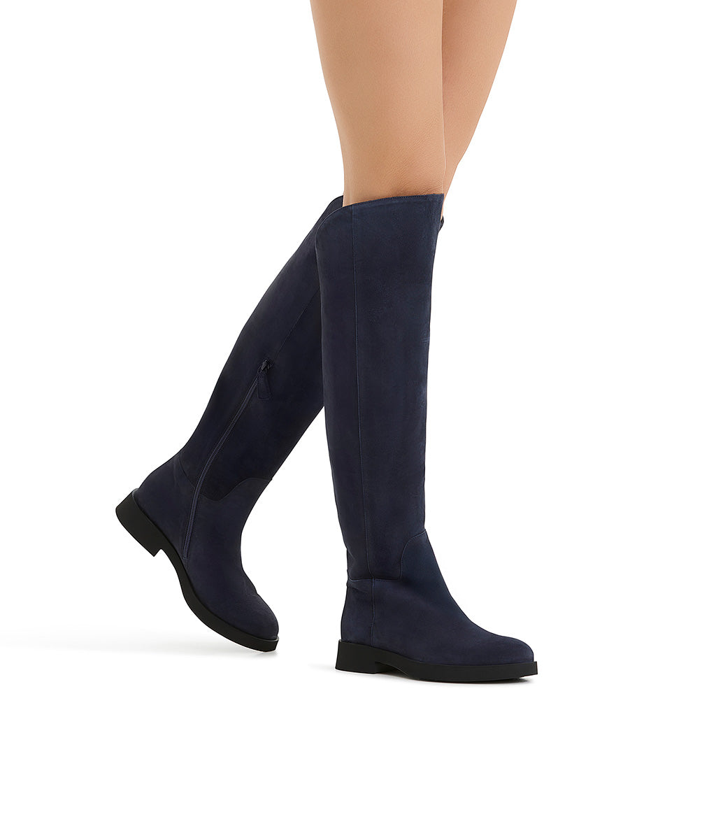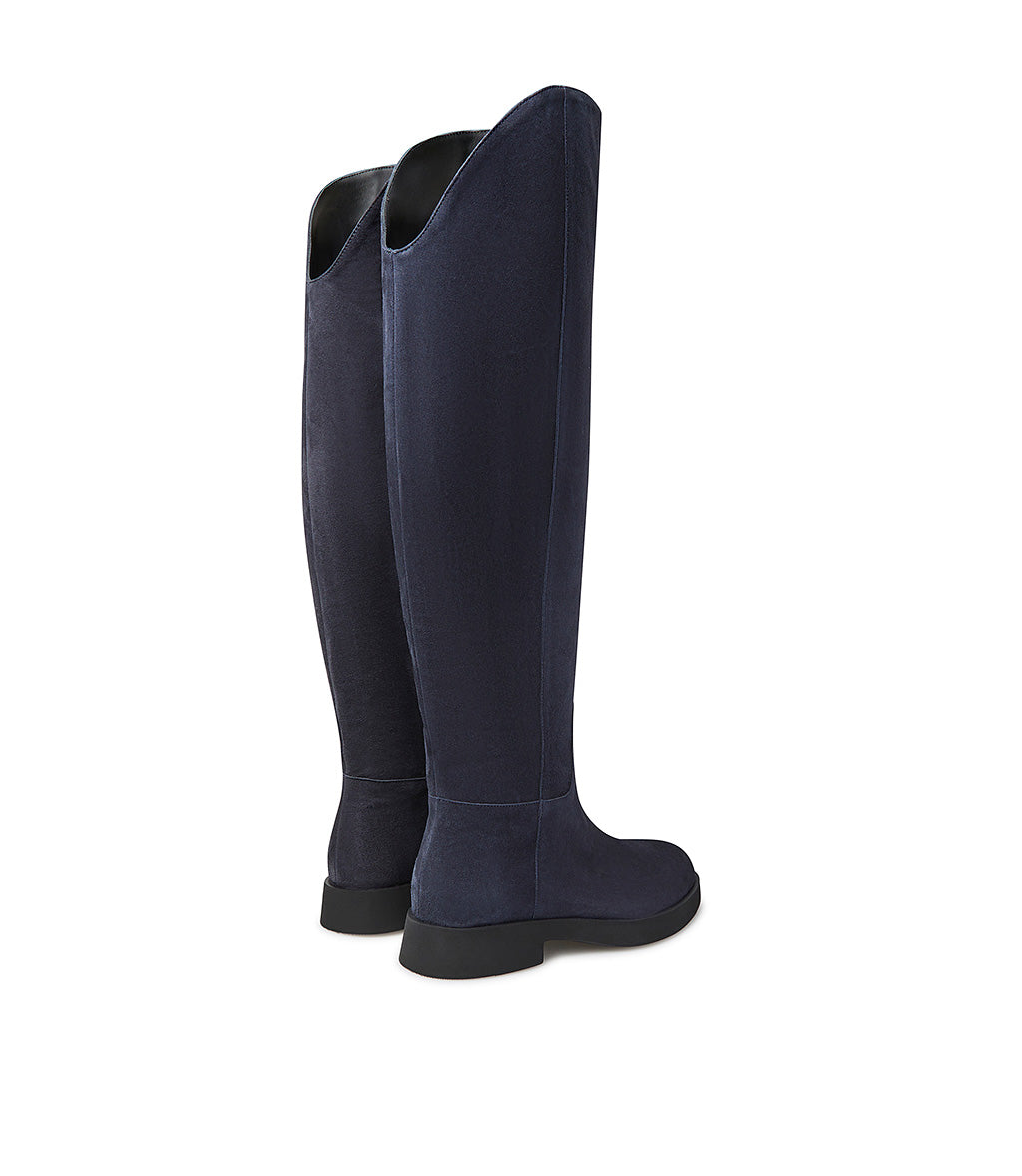 Versatile with a modern design, our over-the-knee boots are crafted in Italy from blue suede. They feature a rounded toe, a higher rounded hem at the front, an internal zip, and a low heel rubber sole. Enhance them with a printed or plain mini dress.