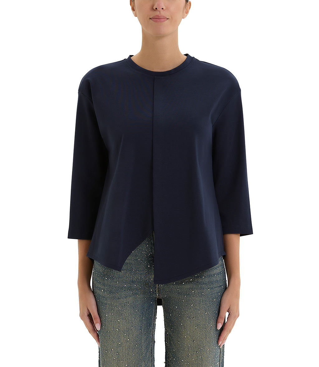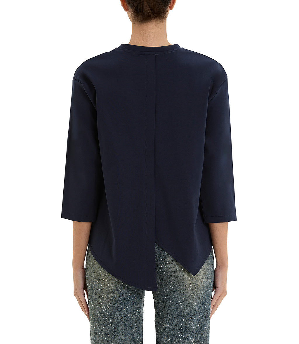 Blue long-sleeved t-shirt with an asymmetrical hem and crew neck finished with a narrow trim. The back features a slightly rounded and longer hem.